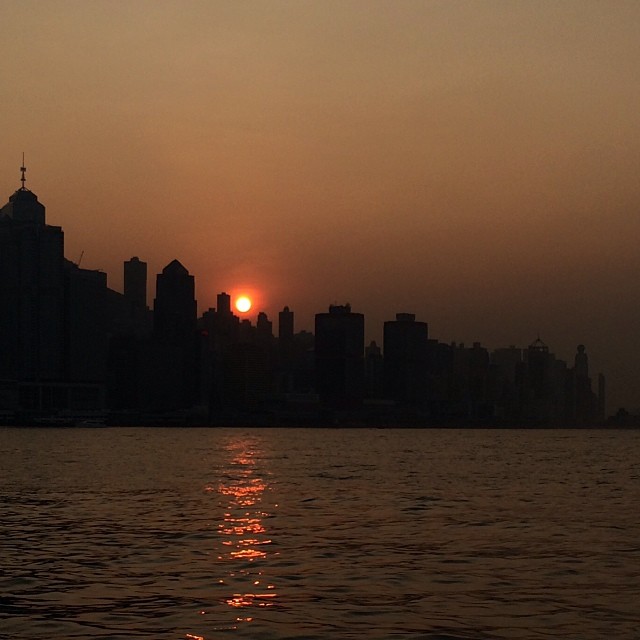 A silhouette of Hong Kong island at sunset