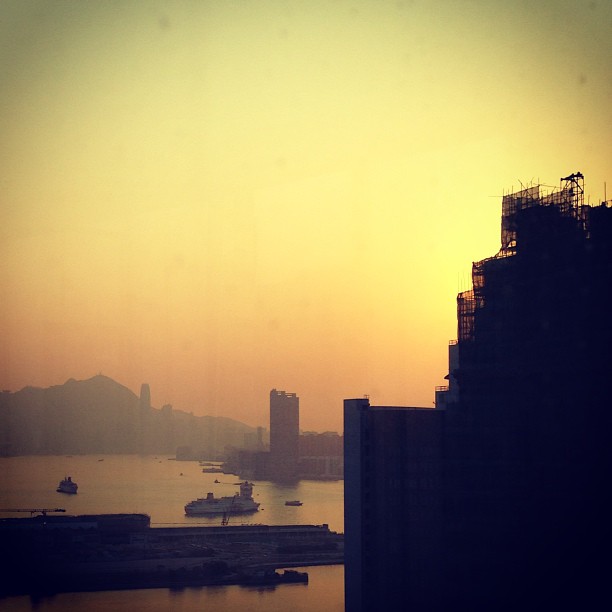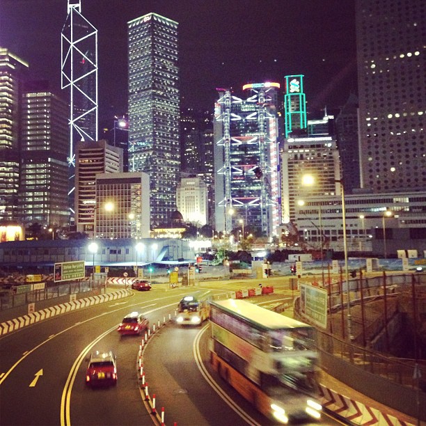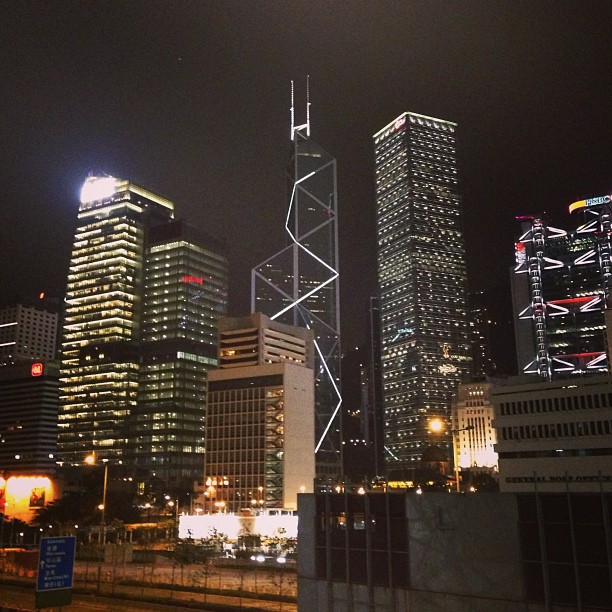 Wan Chai at night lit with neon. View from victoriaharbour Hong Kong