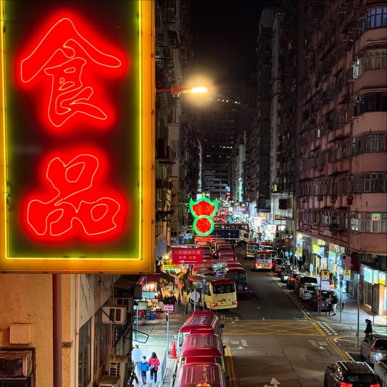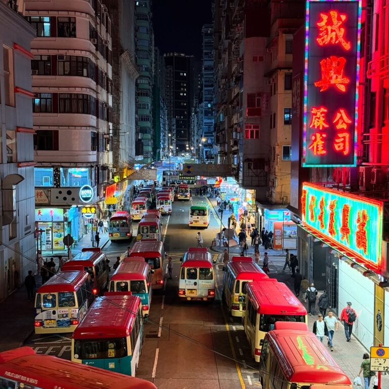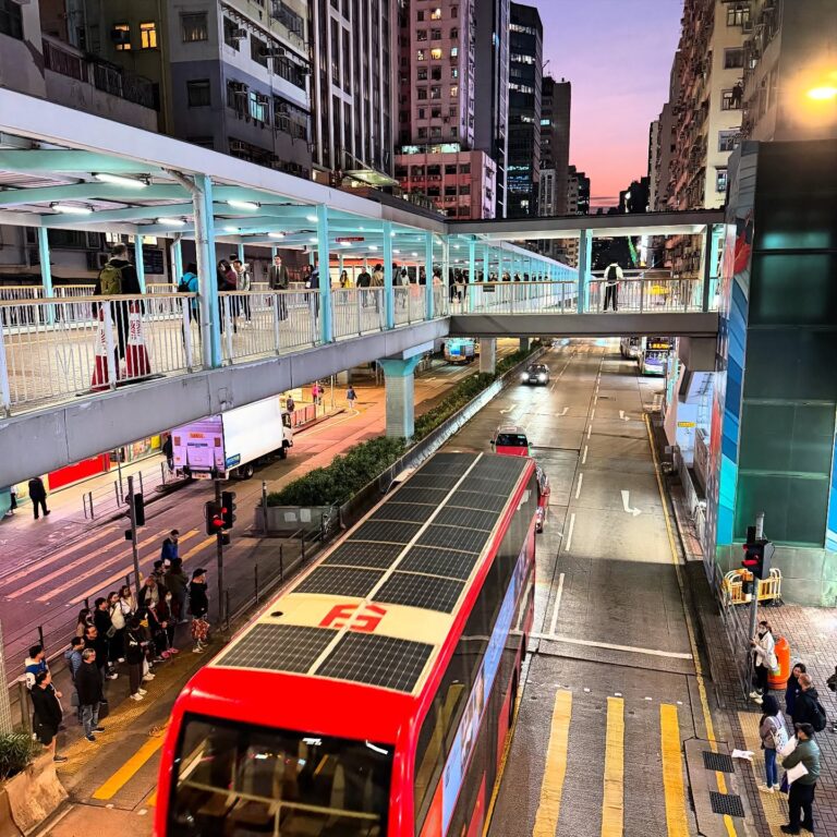 Taking the Hong Kong tram along NorthPoint in the evening. The sunset lines up with the road at this time of year