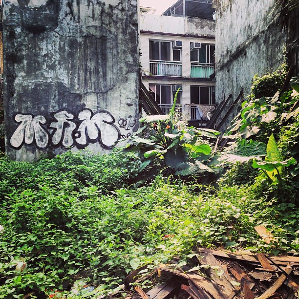 concrete, graffiti, weeds and wood. An abandoned plot of land in between houses