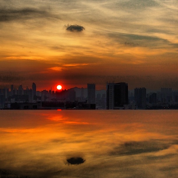 A boat floats just ahead of the pier on victoriaharbour while fluff ball clouds drift lazily across the sky
