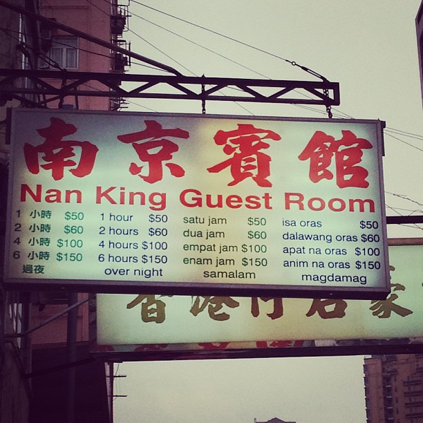 signage for an hourly rate hotel in Kowloon Hong Kong. Language: Chinese, Indonesian and Tagalog. Hmm