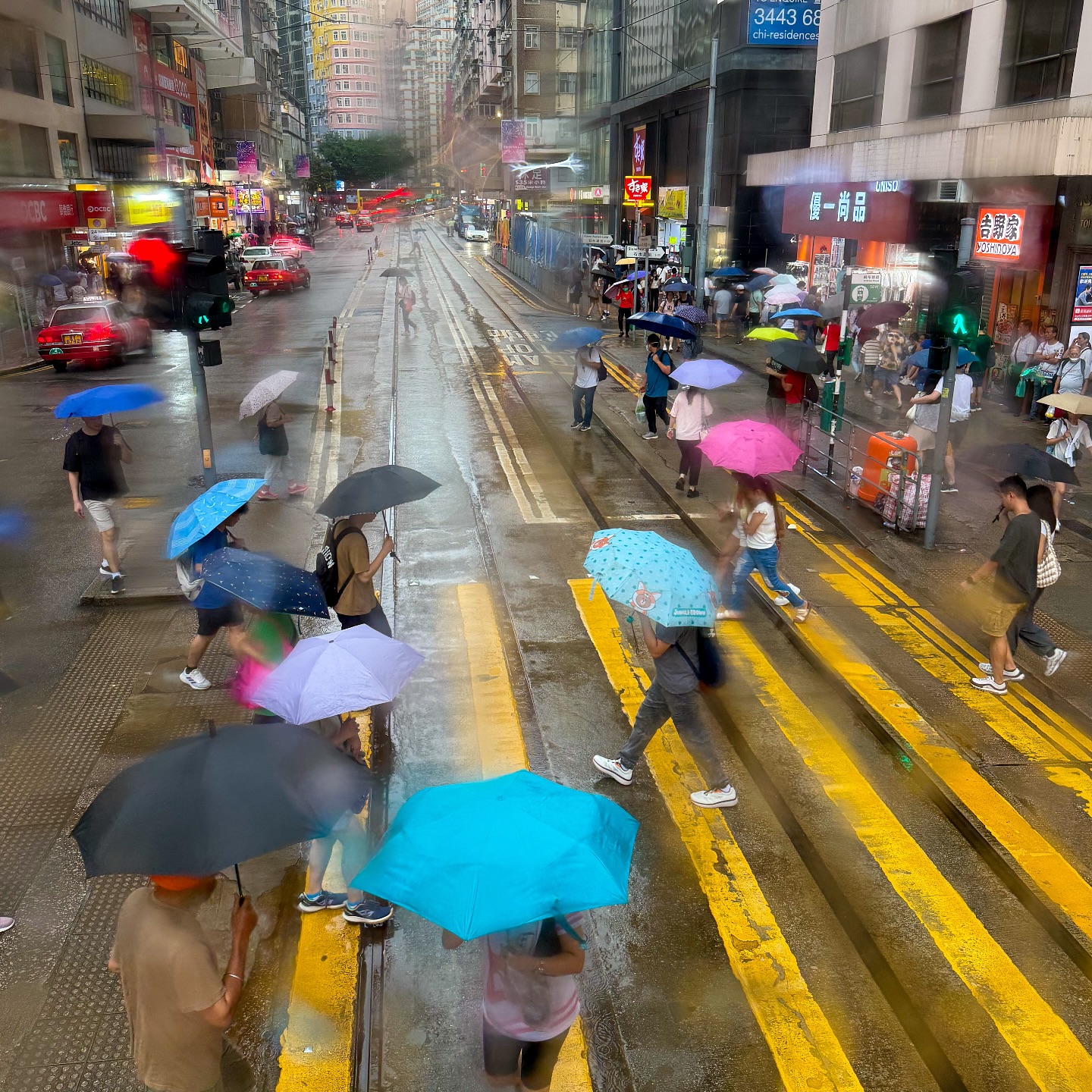 Umbrellas dancing – a view through a rain-streaked window on a rainy day in Hong Kong.